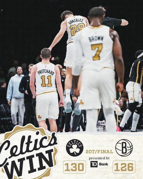 进入第二个加时赛比拼,布朗连续冲击内线得分,波特也接连得分紧咬比分。普里查德上篮扩大4分优势,篮网接连出现失误,凯尔特人保持微弱领先优势,最终凯尔特人双加时130-126险胜篮网。